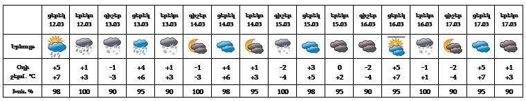 Քամին՝ հյուսիս-արևմտյան՝ 3-7 մ/վ, մարտի 12-13-ն առանձին շրջաններում սպասվում է քամու ուժգնացում՝ 15-20 մ/վ արագությամբ: