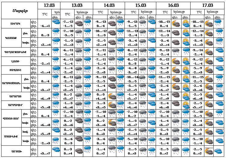 Մարտի 12-ի ցերեկը, 13-ին, 15-ի գիշերը, 16-ին ժամանակ առ ժամանակ շրջանների զգալի մասում, 14-ին, 15-ի և 17-ի ցերեկը առանձին շրջաններում սպասվում են տեղումներ, առանձին հատվածներում՝ ինտենսիվ: Տեղումները լեռնային և նախալեռնային շրջաններում սպասվում են ձյան տեսքով: Լեռնային առանձին շրջաններում սպասվում է բուք, ցածր հորիզոնական տեսանելիություն։