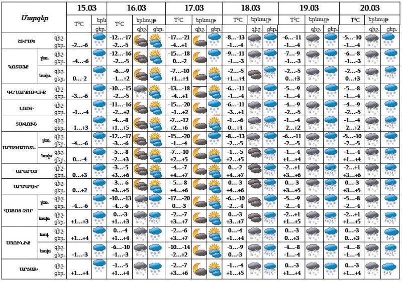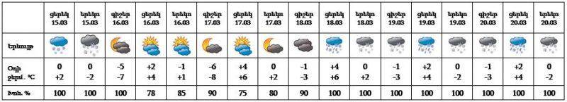Մարտի 15-ի ցերեկը, 18-20-ը ժամանակ առ ժամանակ սպասվում է ձյուն: Մարտի 16-17-ը սպասվում է առանց տեղումների եղանակ: