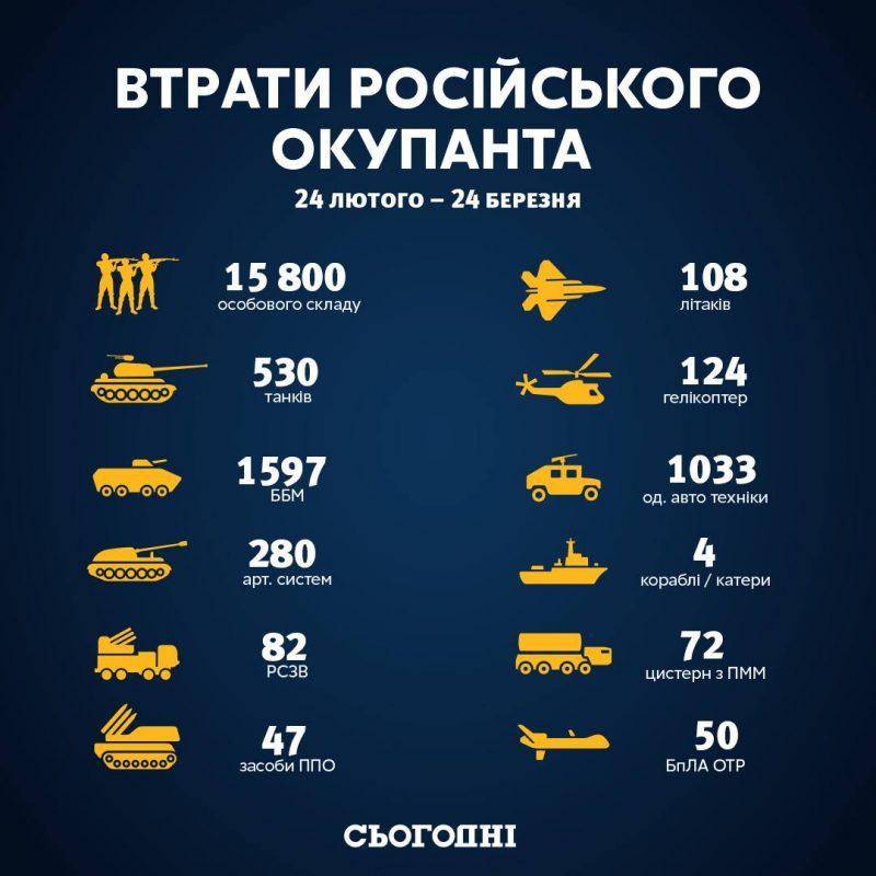 Ուկրաինան հրակարակել է ռուսական կողմի կորուստները՝ մարտի 24-ի դրությամբ.