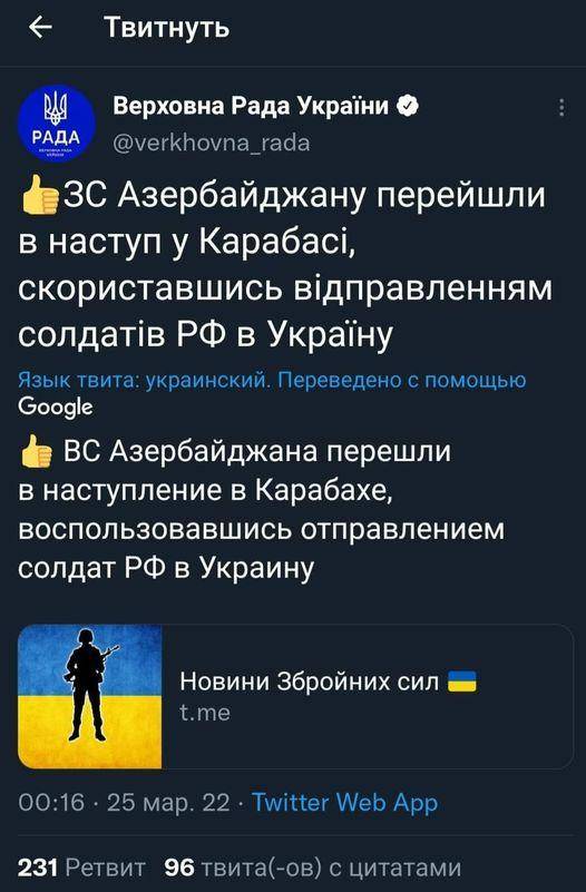 Ուկրաինայի Գերագույն ռադայի պաշտոնական էջը ուրախացել է ,որ թուրքը Արցախում գյուղ է գրավել։