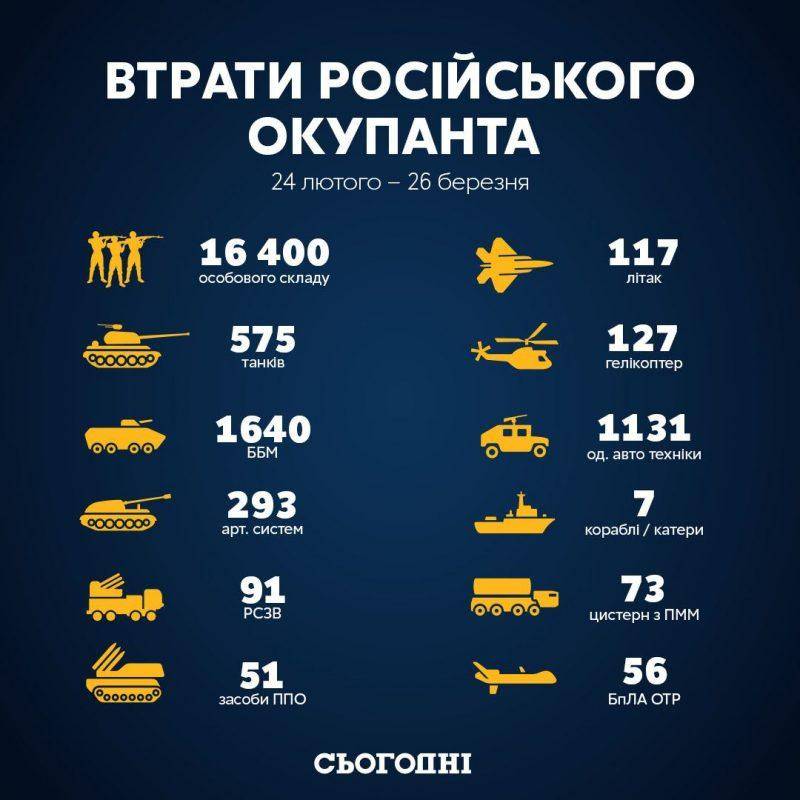 Ուկրաինան հրապարակել է մարտի 26-ի դրությամբ ռուսական կողմի կորւստները: Պատերազմի սկզբից մինչ օրս ռուսական բանակը տվել է 16 400 մարդկային ուժի կորուստ: