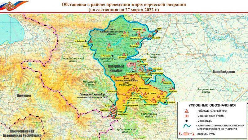 Ռուսաստանի Դաշնության պաշտպանության նախարարությունը հրապարակում է Արցախում տիրող իրավիճակի քարտեզը՝ 2022 թ. մարտի 27-ի դրությամբ: