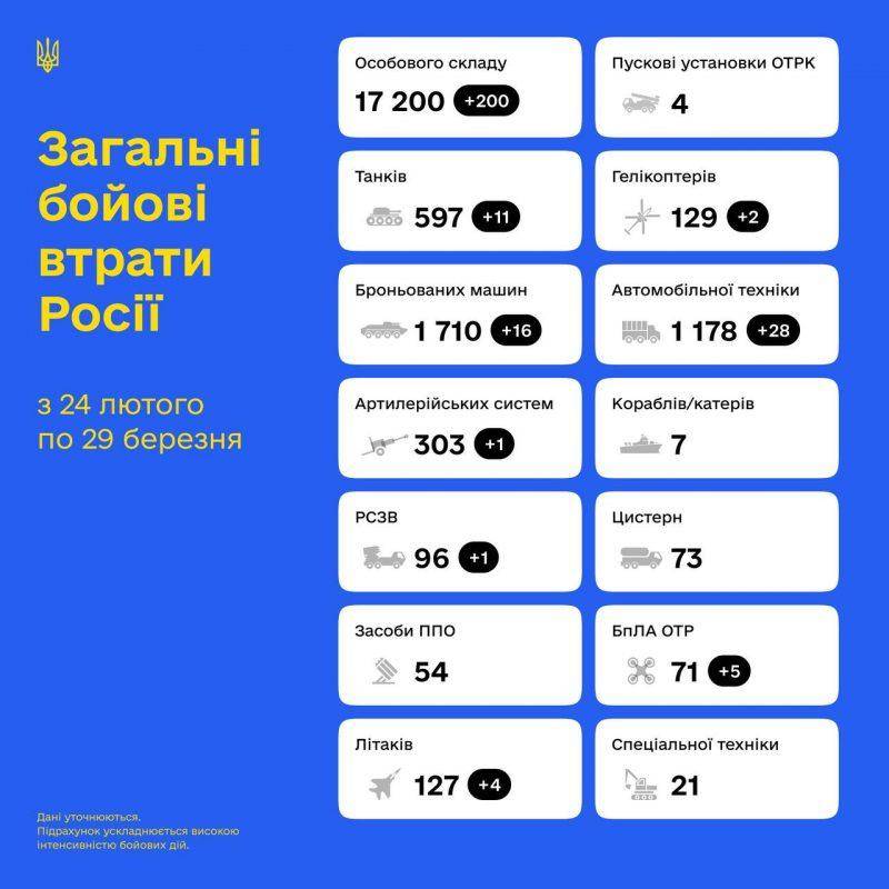 Ուկրաինան հրապարակել է ռուսական կողմի ընդհանուր կորուստները՝ 2022 թվականի մարտի 29-ի դրությամբ: Համաձայն հրապարակման ռուսական կողմը ունի 17200 կենդանի ուժի կորուստ: