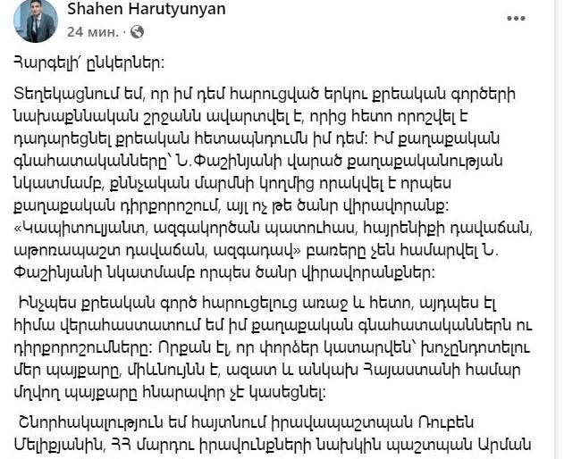 Տեղեկացնում եմ, որ իմ դեմ հարուցված երկու քրեական գործերի նախաքննական շրջանն ավարտվել է, որից հետո որոշվել է դադարեցնել քրեական հետապնդումն իմ դեմ։ Իմ քաղաքական գնահատականները՝ Ն․Փաշինյանի վարած քաղաքականության նկատմամբ, քննչական մարմնի կողմից որակվել է որպես քաղաքական դիրքորոշում, այլ ոչ թե ծանր վիրավորանք։ «Կապիտուլյանտ, ազգակործան պատուհաս, հայրենիքի դավաճան, աթոռապաշտ դավաճան, ազգադավ» բառերը չեն համարվել Ն․Փաշինյանի նկատմամբ որպես ծանր վիրավորանքներ։