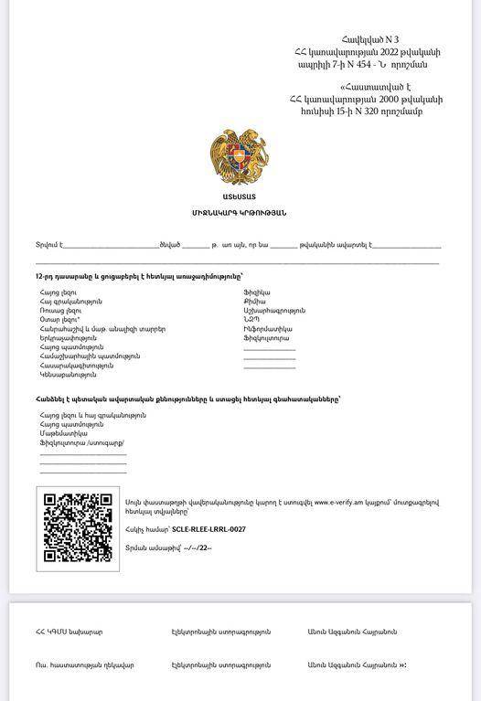 Այս տարվանից ատեստատներն ու հիմնական կրթության վկայականները կտրամադրվեն էլեկտրոնային եղանակով։ Ատեստատը կունենա այս տեքստը։ Դրա հավաստիությունը հնարավոր կլինի ստուգել e-verify.am կայքում՝ հսկիչ համարը մուտքագրելով։ Այս մասին տեղեկացնում է ԿԳՄՍ փոխնախարար Ժաննա Անդրեասյանը։