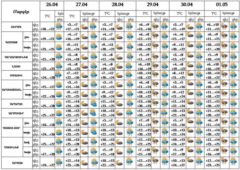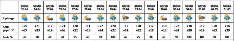 Ապրիլի 26-ի և 27-ի երեկոյան ժամերին քաղաքի առանձին հատվածներում հնարավոր է կարճատև անձրև և ամպրոպ, 28-29-ը, 30-ի ցերեկը, մայիսի 1-ին ժամանակ առ ժամանակ սպասվում է անձրև և ամպրոպ, ամպրոպի ժամանակ՝ քամու ուժգնացում՝ 15-18 մ/վ: