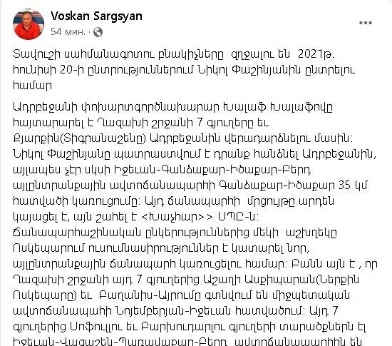 Նիկոլ Փաշինյանը պատրաստվում է դրանք հանձնել Ադրբեջանին, այլապես չէր սկսի Իջեւան-Գանձաքար-Իծաքար-Բերդ այլընտրանքային ավտոճանապարհի Գանձաքար-Իծաքար 35 կմ հատվածի կառուցումը։ Այդ ճանապարհի մրցույթը արդեն կայացել է, այն շահել է <Խաչհար>> ՍՊԸ-ն։ Ճանապարհաշինական ընկերություններից մեկի աշխղեկը Ոսկեպարում ուսումնասիրություններ է կատարել նոր, այլընտրանքային ճանապարհ կառուցելու համար։ Բանն այն է , որ Ղազախի շրջանի այդ 7 գյուղերից Աշաղի Ասքիպարան(Ներքին Ոսկեպարը) եւ Բաղանիս-Այրումը գտնվում են միջպետական ավտոճանապահի Նոյեմբերյան-Իջեւան հատվածում։