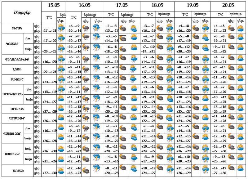 Օդի ջերմաստիճանը մայիսի 15-ի ցերեկը կբարձրանա ևս 2-3 աստիճանով, 16-ի ցերեկը կնվազի 7-10 աստիճանով, այնուհետև աստիճանաբար նույնքան կբարձրանա:
