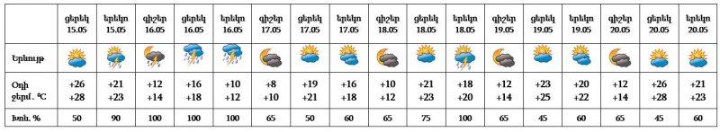 Մայիսի 15-ի, 17-19-ի ցերեկն առանձին շրջաններում սպասվում է կարճատև անձրև և ամպրոպ: Մայիսի 16-ին հանրապետության ողջ տարածքում ժամանակ առ ժամանակ սպասվում է անձրև և ամպրոպ, առանձին հատվածներում՝ ինտենսիվ: Առանձին հատվածներում հնարավոր է նաև կարկուտ: Մայիսի 17-19-ի գիշերը, 20-ին սպասվում է առանց տեղումների եղանակ: