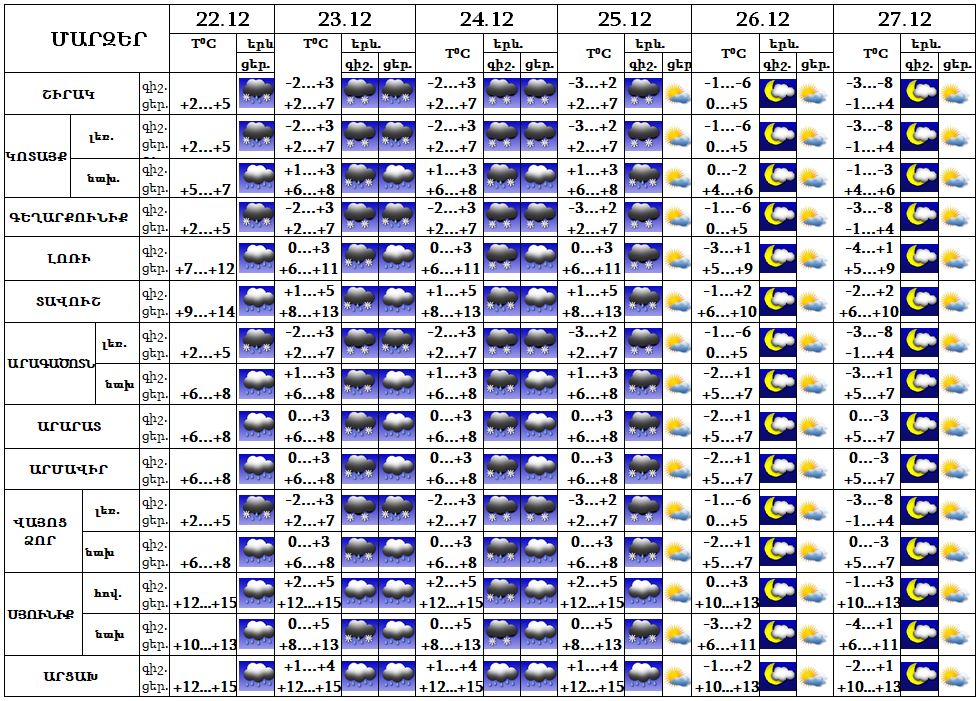 Դեկտեմբերի 22-ի ցերեկը, 23-24-ը, 25-ի գիշերը ժամանակ առ ժամանակ, դադարներով, սպասվում են տեղումներ և մառախուղ: 25-ի ցերեկը, 26-27-ը սպասվում է առանց տեղումների եղանակ, 22-24-ը սպասվում է քամու ուժգնացում՝ 15-20 մ/վ:
