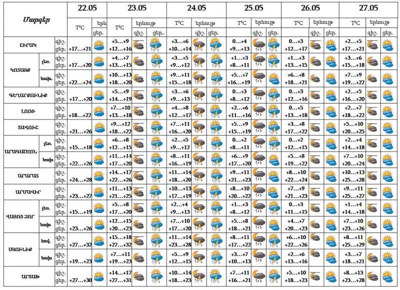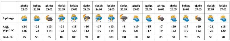 Մայիսի 22-ի ցերեկը, 23-ի գիշերը, 25-ի ցերեկը, 26-27-ը սպասվում է առանց տեղումների եղանակ: Մայիսի 23-ի ցերեկը, 24-ին, 25-ի գիշերը ժամանակ առ ժամանակ սպասվում է անձրև և ամպրոպ, ամպրոպի ժամանակ՝ քամու ուժգնացում՝ 15-18 մ/վ: