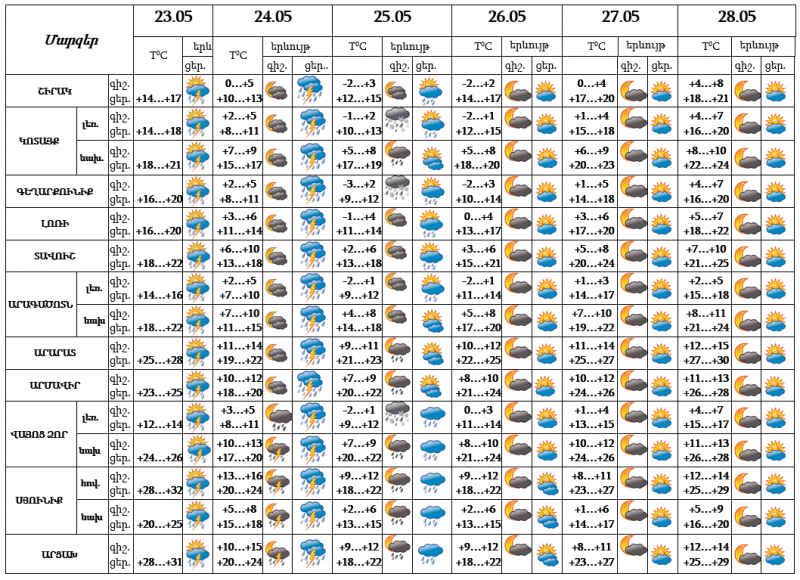 Մայիսի 23-ի ցերեկը, 24-ին, 25-ի գիշերը ժամանակ առ ժամանակ սպասվում է անձրև և ամպրոպ, ամպրոպի ժամանակ քամու ուժգնացում՝ 15-18 մ/վ: Մայիսի 25-ի ցերեկը, 26-28-ը սպասվում է առանց տեղումների եղանակ: