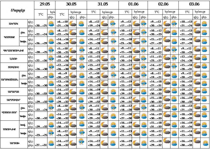 Մայիսի 29-ի, 30-31-ի, հունիսի 1-2-ը կեսօրից հետո առանձին շրջաններում սպասվում է կարճատև անձրև և ամպրոպ: Առանձին հատվածներում հնարավոր է նաև կարկուտ: Մայիսի 30-31-ի, հունիսի 1-2-ի գիշերը, 3-ին սպասվում է առանց տեղումների եղանակ: