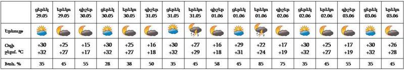 Մայիսի 29-ի ցերեկը, 30-ին, 31-ի գիշերը, հունիսի 2-3-ը սպասվում է առանց տեղումների եղանակ: Մայիսի 31-ի և հունիսի 1-ի երեկոյան ժամերին քաղաքի առանձին հատվածներում սպասվում է կարճատև անձրև և ամպրոպ, ամպրոպի ժամանակ սպասվում է քամու ուժգնացում՝ 15-18 մ/վ արագությամբ։
