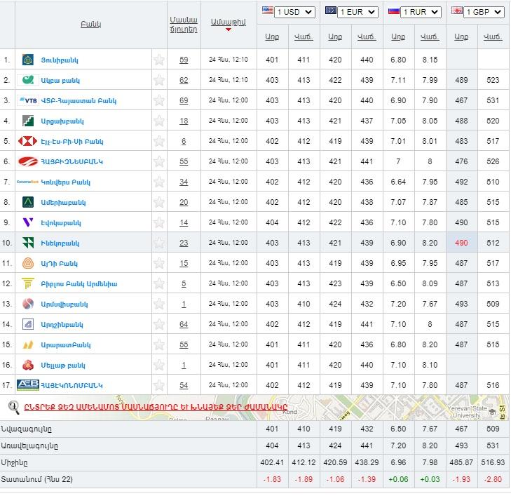 Ներկայացնում ենք Հայաստանի բանկերի կողմից գնվող և վաճառվող արտարժույթների փոխարժեքները հունիսի 24-ի դրությամբ՝ ըստ rate.am-ի:
