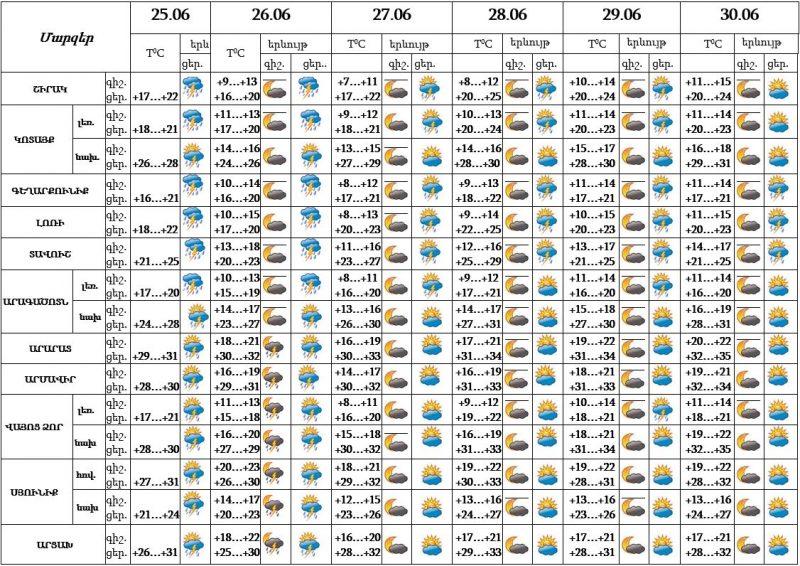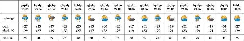 Հունիսի 25-ին, 27-30-ի գիշերը և կեսօրից հետո առանձին շրջաններում, 25-26-ի ցերեկը շրջանների զգալի մասում սպասվում է անձրև և ամպրոպ: Առանձին հատվածներում սպասվում է նաև կարկուտ: