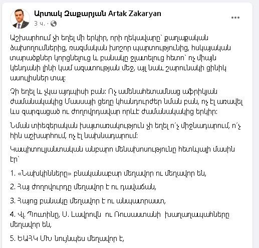 Աշխարհում չի եղել մի երկիր, որի ղեկավարը` քաղաքական ձախողումներից, ռազմական խոշոր պարտությունից, հսկայական տարածքներ կորցնելուց և բանակը ջլատելուց հետո` ոչ միայն կենդանի լինի կամ ազատության մեջ, այլ նաև շարունակի ցինիկ ասուլիսներ տալ: