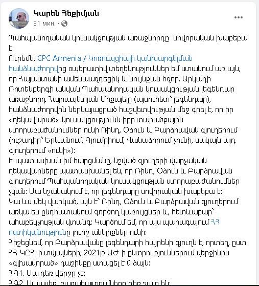 Իրավապաշտպան Կարեն Հեքիմյանը ֆեսբուքյան իր էջում գրում է․
