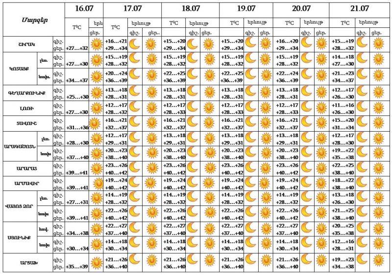 Հանրապետության տարածքը շարունակում է գտնվել Արաբական թերակղզու շրջաններից արևադարձային տաք օդային հոսանքների ազդեցության գոտում, ինչով պայմանավորված Արարատյան դաշտում, Արագածոտնի, Վայոց ձորի նախալեռնային գոտիներում և Երևանում հուլիսի 16-21-ի ցերեկային ժամերին օդի ջերմաստիճանը կհասնի +39…+42 աստիճանի։