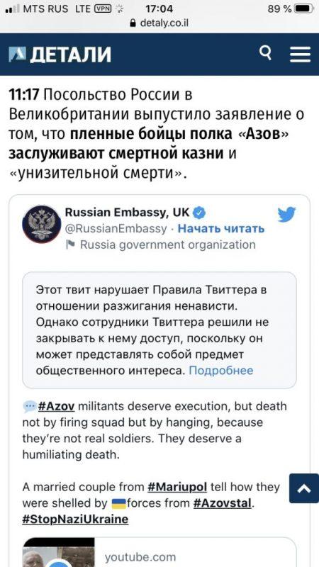 Հուլիսի 29-ին Մեծ Բրիտանիայում Ռուսաստանի դեսպանատան Twitter-ի պաշտոնական էջում հաղորդագրություն է հրապարակվել, որում դեսպանատունը կոչ է անում մահապատժի ենթարկել ուկրաինական Ազովի գնդի գերի ընկած զինվորներին։