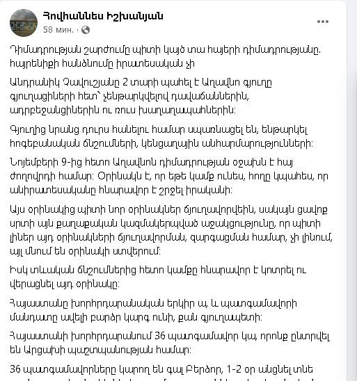 Եվ որևէ խոսք ընդունելի չի այն մասին, թե իրատեսական չի, հնարավոր չի պահել Բերձորը։ Որևէ բան չարած, միայն գյուղապետի հետ խոսացած ասե՞լ իրատեսական չի՞: Որոշակի ռեսուրս կա, որոշակիկամք կա,օգտագործեք ու իրատեսականը շրջեք իրականի: Տիեզերք թռնելն էլ, Արցախը ազատագրելն էլ իրատեսական չէին։