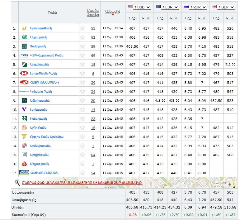 Համաձայն այդ տվյալների՝ օգոստոսի 11-ին ԱՄՆ դոլարի գնման միջին արժեքը 406,74 դրամ է, որը նախորդ օրվա համեմատ 0,28 դրամով նվազել է։ Ամերիկյան արժույթը վաճառվում է 416,76 դրամ, որը 0,06 դրամով ավելի է անխորդ օրվա համեմատ։