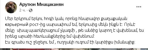 Մեր երկրում երկու հոգի կան, որոնց հնարավոր քաղաքական карьерный рост-ից սարսափում եմ, երկուսից մեկն ինքն է։ Որևէ մեկը սխալ պատկերացում չկազմի , թե անձից կարող է վախենամ, ես իրենց արածի հետևանքներից եմ վախենում։