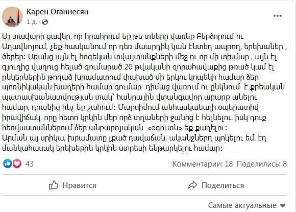 Արցախի Ազգային ժողովի «Արդարություն» խմբակցության պատգամավոր Կարեն Հովհաննիսյանը ֆեյսբուքյան իր էջում գրում է.