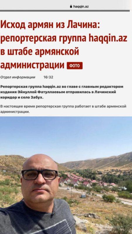Haqqin.az-ի խմբագիր Էյնուլա Ֆաթուլաեւը տեղեկություն է հրապարակել, որ իր գլխավորած լրատվամիջոցի նկարահանող խումբն այս պահին գտնվում է հայկական ղեկավարության շտաբում եւ առաջիկա օրերին ռեպորտաժների շարք են հրապարակելու Լաչինը (Բերձորն) ու Զաբուխը (Աղավնոն) անօրինական օկուպացրած հայերի տարհանման մասին։
