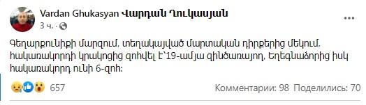 Գեղարքունիքի մարզում, տեղակայված մարտական դիրքերից մեկում, հակառակորդի կրակոցից զոհվել է 19-ամյա զինծառայող, իսկ Եղեգնաձորից հակառակորդն ունի 6 զոհ:
