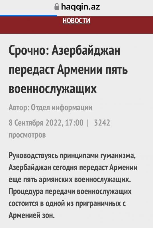 Պաշտոնական Բաքուն հայտնում է, որ այսօր հայկական կողմին կվերադարձվեն հինգ ռազմագերի։