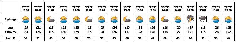 Երևան քաղաքում՝ սեպտեմբերի 10-ի ցերեկը, 11-13-ը և 15-ի ցերեկը սպասվում է առանց տեղումների եղանակ: Սեպտեմբերի 14-ի երեկոյան ժամերին, 15-ի գիշերը սպասվում անձրև և ամպրոպ: Ամպրոպի ժամանակ սպասվում է քամու ուժգնացում 15-19 մ/վ: