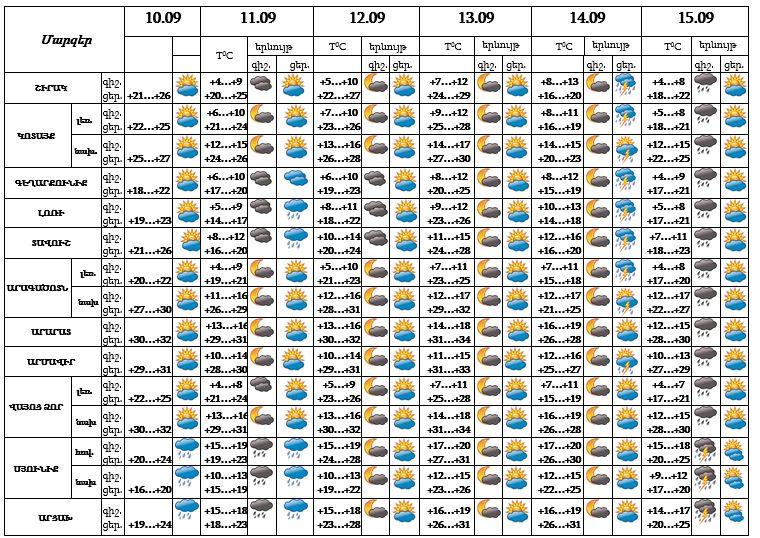 Հայաստանի Հանրապետության տարածքում` սեպտեմբերի 10-ի ցերեկը, 11-ին և 14-ի ցերեկը առանձին շրջաններում, 15-ի գիշերը շրջանների զգալի մասում սպասվում է անձրև, 14-ին նաև ամպրոպ: Ինչպես հայտնում է ԱԻՆ–ը, սեպտեմբերի 12-13-ը, 14-ի գիշերը և 15-ի ցերեկը սպասվում է առանց տեղումների եղանակ:
