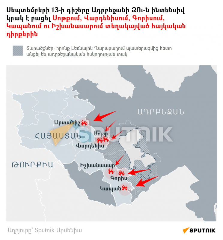 ՀՀ պաշտպանական գերատեսչությունը հաղորդագրություն էր տարածել` հայտնելով, որ սեպտեմբերի 13-ին՝ ժամը 00:05-ից, Ադրբեջանի ԶՈւ ստորաբաժանումները Գորիսի, Սոթքի և Ջերմուկի ուղղությամբ հրետանային միջոցներից, խոշոր տրամաչափի հրաձգային զինատեսակներից սկսել են ինտենսիվ կրակ վարել հայկական դիրքերի ուղղությամբ: Տեղեկությունը կեսգիշերն անց հայտնել է ՀՀ պաշտպանության նախարարությունը։