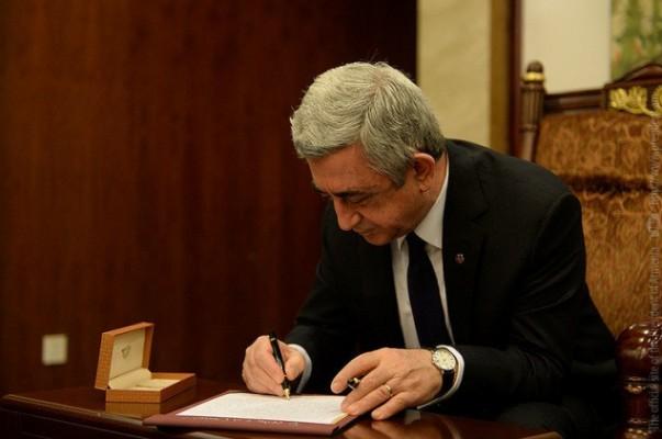 Նախագահ Սերժ Սարգսյանն այսօր ստորագրել է Ազգային ժողովի ընդունած Հայաստանի Հանրապետության ընտանեկան օրենսգրքում փոփոխություններ և լրացումներ կատարելու մասին, Վարչական իրավախախտումների վերաբերյալ Հայաստանի Հանրապետության օրենսգրքում լրացումներ կատարելու մասին, Հայաստանի Հանրապետության քաղաքացիական դատավարության օրենսգրքում փոփոխություններ և լրացում կատարելու մասին,