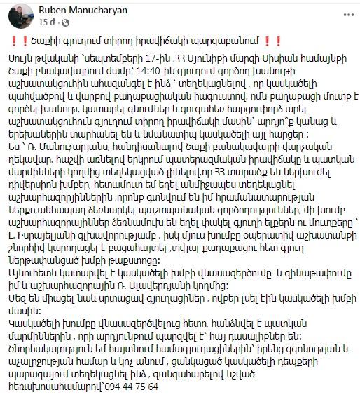 Ռուբեն Մանուչարյանը ֆեյսբուքյան իր էջում գրել է․ Շաքիի գյուղում տիրող իրավիճակի պարզաբանում․ Սույն թվականի՝ սեպտեմբերի 17-ին, ՀՀ Սյունիքի մարզի Սիսիան համայնքի Շաքի բնակավայրում ժամը՝ 14։40-ին գյուղում գործող խանութի աշխատակցուհին ահազանգել է ինձ՝ տեղեկացնելով, որ կասկածելի պահվածքով և վարքով քաղաքացիական հագուստով, ոմն քաղաքացի մուտք է գործել խանութ, կատարել գնումներ և զուգահեռ հարցուփորձ արել աշխատակցուհուն գյուղում տիրող իրավիճակի մասին՝ արդյո՞ք կանաց և երեխաներին տարհանել են և նմանատիպ կասկածելի այլ հարցեր։