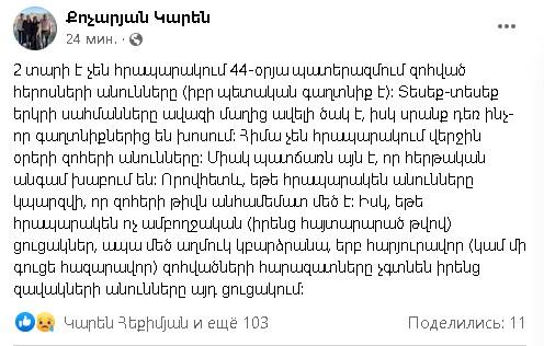 2 տարի է չեն հրապարակում 44-օրյա պատերազմում զոհված հերոսների անունները (իբր պետական գաղտնիք է): Տեսեք-տեսեք երկրի սահմանները ավազի մաղից ավելի ծակ է, իսկ սրանք դեռ ինչ-որ գաղտնիքներից են խոսում: