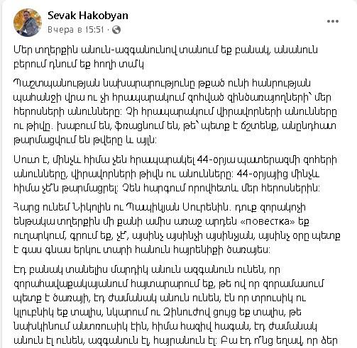 Պաշտպանության նախարարությունը թքած ունի հանրության պահանջի վրա ու չի հրապարակում զոհված զինծառայողների՝ մեր հերոսների անունները։ Չի հրապարակում վիրավորների անունները ու թիվը․ խաբում են, ֆռացնում են, թե՝ պետք է ճշտենք, անընդհատ թարմացվում են թվերը և այլն։