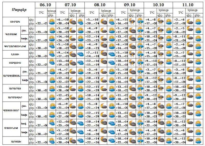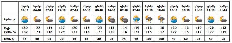 Հոկտեմբերի 6-ի ցերեկը, 7-8-ին, 10-ի ցերեկը, 11-ին սպասվում է առանց տեղումների եղանակ: Հոկտեմբերի 9-ի առավոտյան ժամերին և ցերեկը, 10-ի գիշերը սպասվում է անձրև և ամպրոպ, ամպրոպի ժամանակ նաև քամու ուժգնացում` մինչև 15-18 մ/վ արագությամբ:
