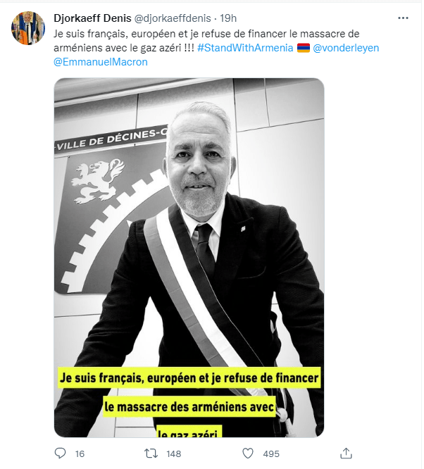 «Ես ֆրանսիացի եմ, եվրոպացի և հրաժարվում եմ ադրբեջանական գազի գնմամբ ֆինանսավորել հայերի կոտորածը»: Այս մասին հայտարարել է Ֆրանսիայում Հայաստանի պատվավոր հյուպատոս, Ֆրանսիացի հայտնի ֆուտբոլիստ Յուրի Ջորկաեֆի եղբայր Դենիս Ջորկաեֆը: