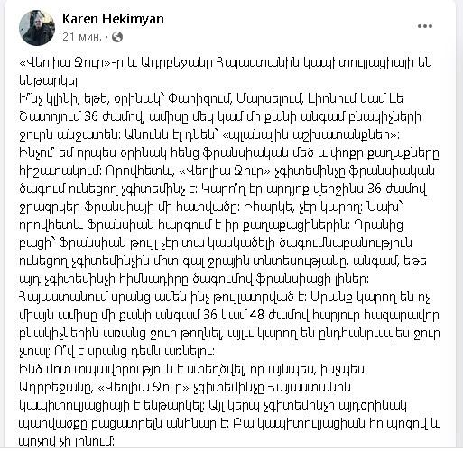 Իրավապաշտպան Կարեն Հեքիմյանը ֆեյսբուքյան իր էջում գրում է․