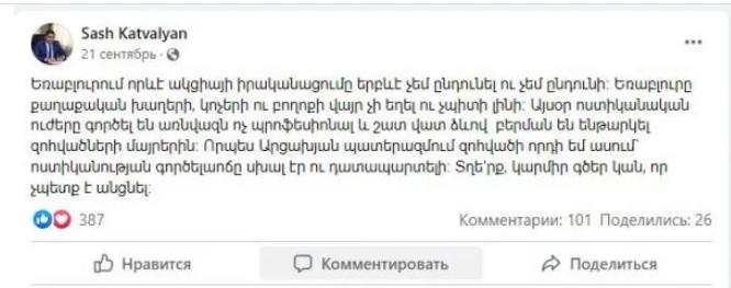 Իսկ ինչի մասին է խոսքը․ խոսքը նրա սեպտեմբերի 21-ի գրառման մասին է։ Հենց այդ օրն էին ոստիկանները Եռաբլուր զինվորական պանթեոնում բռնի ուժով բերման ենթարկել անհետ կորած զինծառայողների ծնողներին։ Այդ օրը նա սոցիալական ցանցի իր էջում գրել էր․ «Եռաբլուրում որևէ ակցիայի իրականացումը երբևէ չեմ ընդունել ու չեմ ընդունի։ Եռաբլուրը քաղաքական խաղերի, կոչերի ու բողոքի վայր չի եղել ու չպիտի լինի։ Այսօր ոստիկանական ուժերը գործել են առնվազն ոչ պրոֆեսիոնալ և շատ վատ ձևով բերման են ենթարկել զոհվածների մայրերին։ Որպես Արցախյան պատերազմում զոհվածի որդի եմ ասում` ոստիկանության գործելաոճը սխալ էր ու դատապարտելի։ Տղե’րք, կարմիր գծեր կան, որ չպետք է անցնել»: