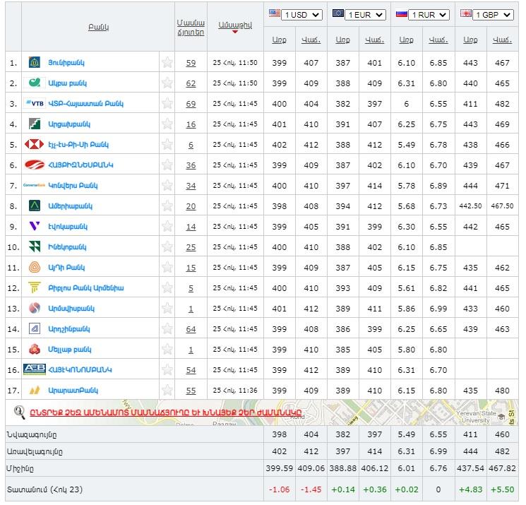 Ռուսական մեկ ռուբլին գնվում է առավելագույնը 6.31 դրամով (նվազագույնը 5.49 դրամ), վաճառվում՝ 6.99 դրամով (նվազագույնը 6.55) դրամով։