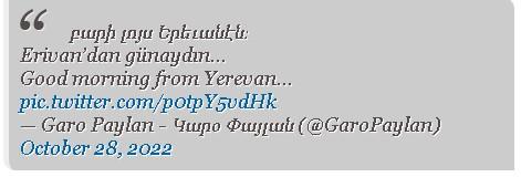 Թուրքական խորհրդարանի հայազգի պատգամավոր Գարո Փայլանը Հայատանում է։ Այս մասին նա հայտել է իր թվիթերյան էջում՝ տեղադրելով լուսանկարներ և մակագրելով արևմտահայերենով, թուրքերեն և անգլերեն լեզուներով՝ բարի լույս Երևանից։