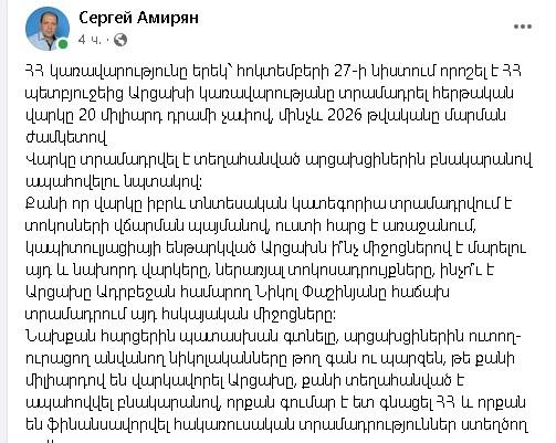 Արցախում նախագահի նախկին թեկնածու Սերգեյ Ամիրյաը գրում է