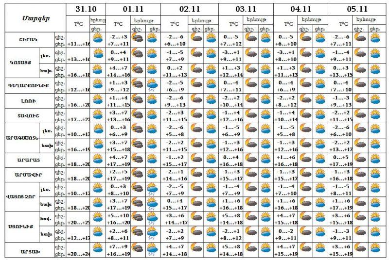 Հոկտեմբերի 31-ի ցերեկը, նոյեմբերի 2-5-ը սպասվում է առանց տեղումների եղանակ: Նոյեմբերի 1-ին առանձին շրջաններում հնարավոր է թույլ տեղումներ: