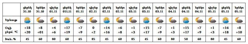 Հոկտեմբերի 31-ի ցերեկը, նոյեմբերի 2-5-ը սպասվում է առանց տեղումների եղանակ: Նոյեմբերի 1-ին քաղաքի առանձին հատվածներում հնարավոր է կարճատև անձրև և քամու ուժգնացում` 17-20 մ/վ: