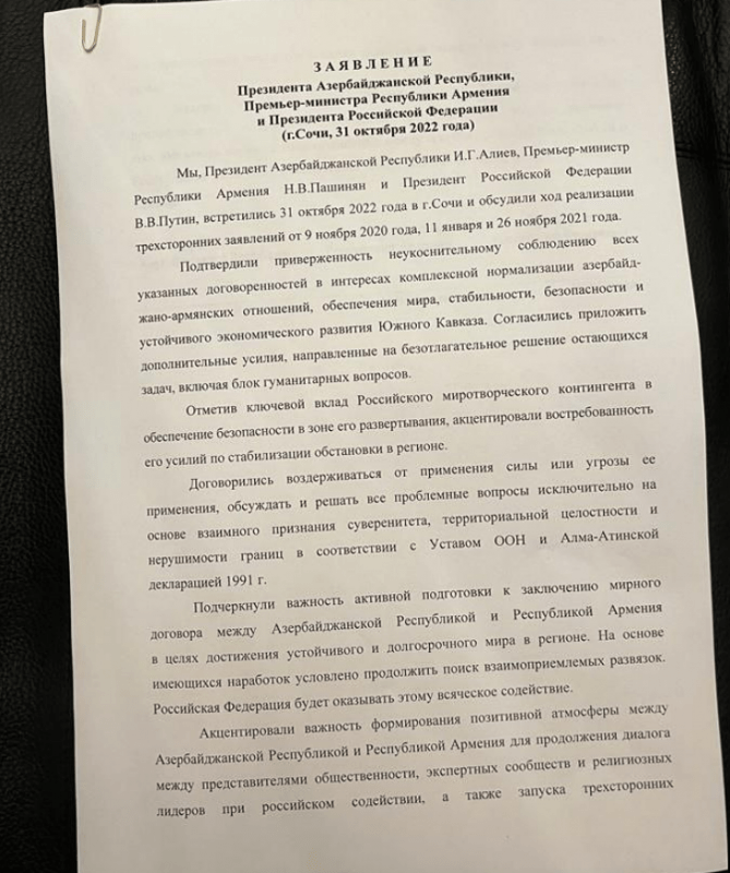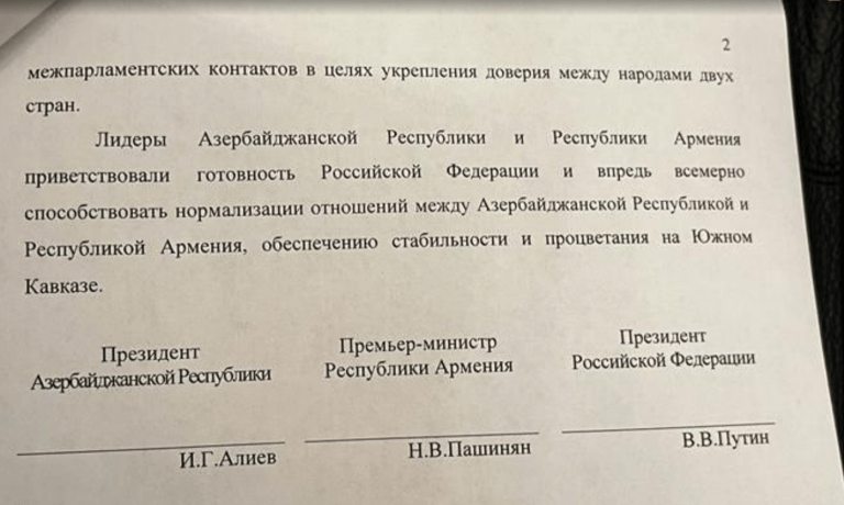 Տելեգրամյան ալիքներում տարածվել է Նիկոլ Փաշինյանի, Վլադիմիր Պուտինի և Իլհամ Ալիևի համատեղ հայտարարության տեքստը
