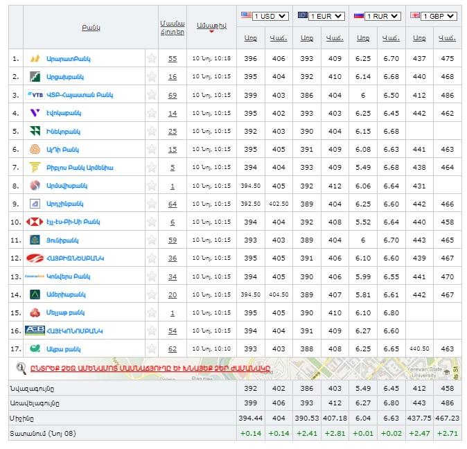 Rate.am կայքից տեղեկանում ենք, որ դոլարի առքի ամենաբարձր գինը բանկերում 398 դրամ է, վաճառքի դեպքում ամենացածր գինը՝ 402 դրամ: